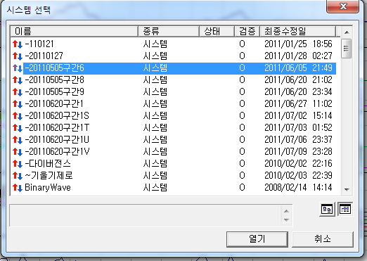 시스템선택창에서 리스트가 안나오는 이유는 검증이 제대로 안되었거나, 시스템식에 buy나 sell과 같은 진입신호가 없는 경우인데, 다시한번 검증과 시스템식에 buy나 sell식이 있는지 확인을 부탁드립니다. 이 내용에 이상이 없다면 번거로우시겠지만, 시스템식 새로 만들기하여 기존식의 내용을 복사해서 만들어 주시고 문제가 되는 원본 파일의 식 내용을 변경(중요하지 않은 식으로)하여 저장하고 chartist@yesstock.com 으로 메일 첨부하여 송부해 주시길 부탁드립니다.