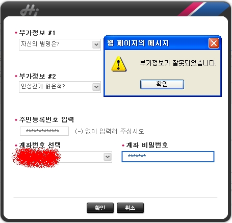 모두 입력하고 확인 눌르면 "부가정보가 잘못되었습니다"란 메시지가 뜨면서 넘어 가지를 않습니다.