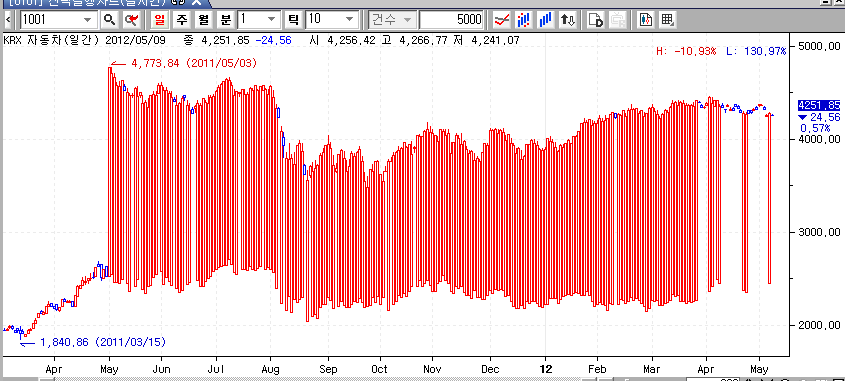 KRX 자동차 업종 차트 데이터 일주월 모두 오류가 있습니다.