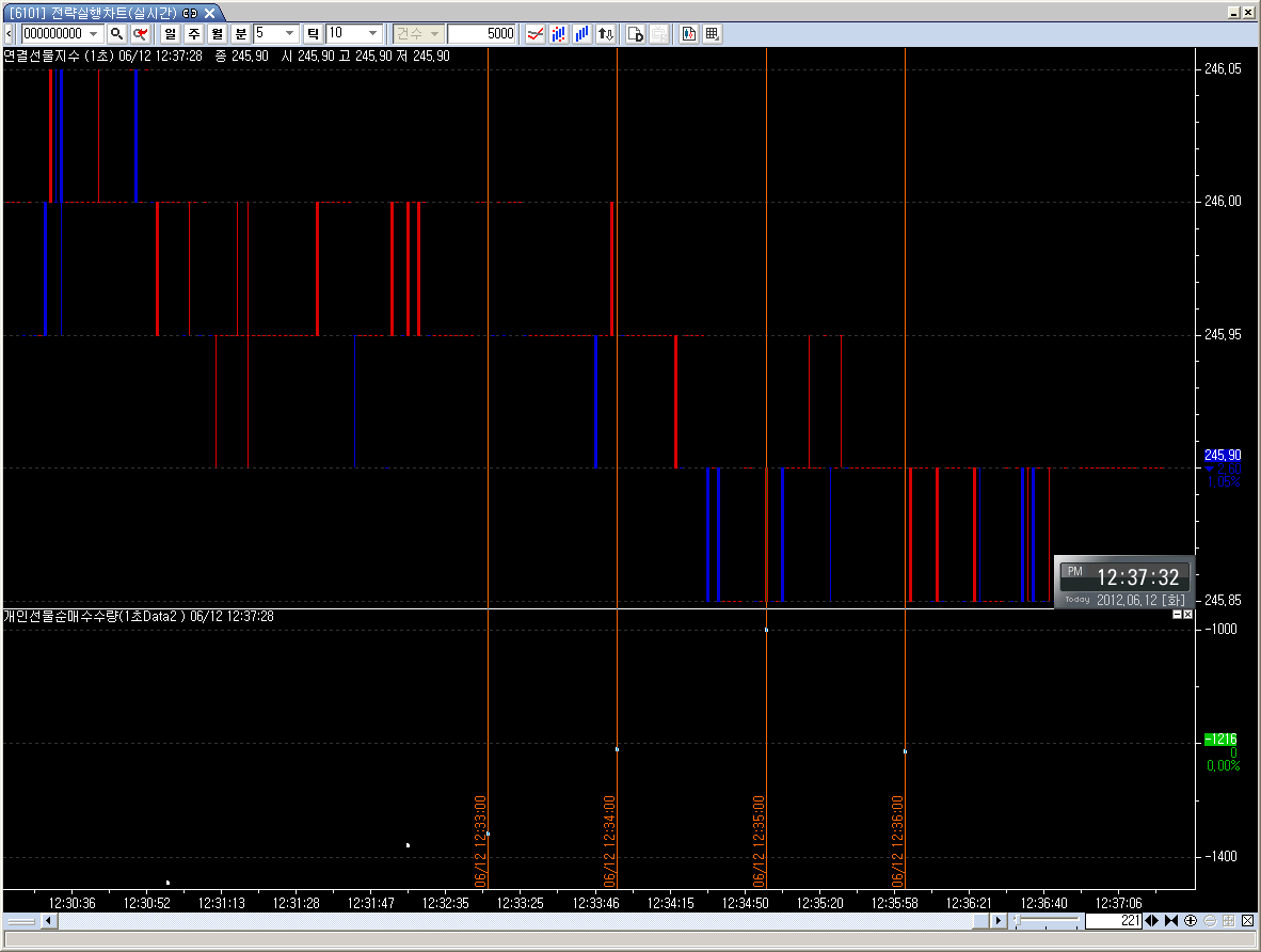 선물과 옵션의 주체별 데이터는 거래소에서 시간을 달고 들어오는데, 말씀하신 것처럼 30초 정도 데이타가 늦게 들어옵니다. 따라서 차트에 30초 정도 늦게 차팅이 됩니다.
