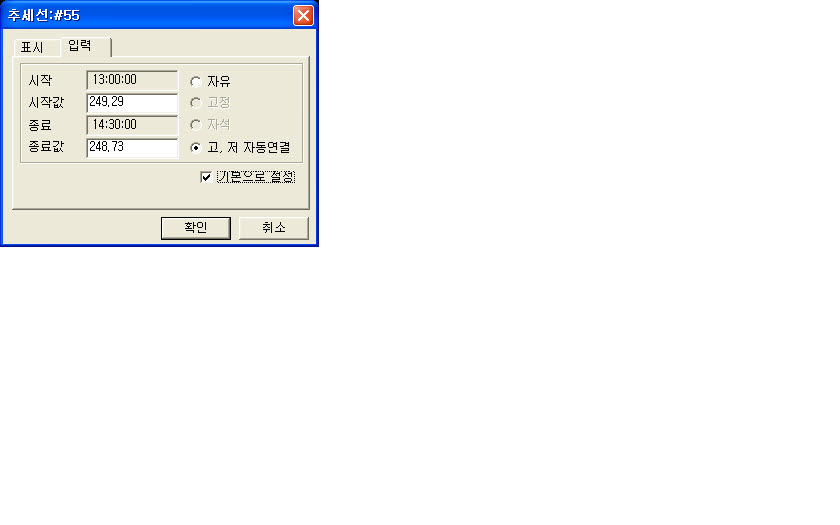 추세선 설정할때 에러뜹니다. 첨부파일2처럼 하고 확인하면 첨부파일1처럼 뜹니다. 확인해주시고 고쳐주세요.