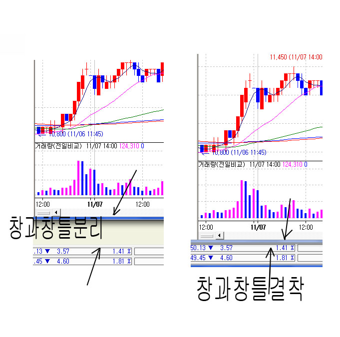 차트창 상단의 타이틀바(종목명이 나오는 곳)를 드래그하시면 도킹됩니다. 또 도킹상태에서 타이틀바를 더블클릭하시면 플로팅 됩니다.