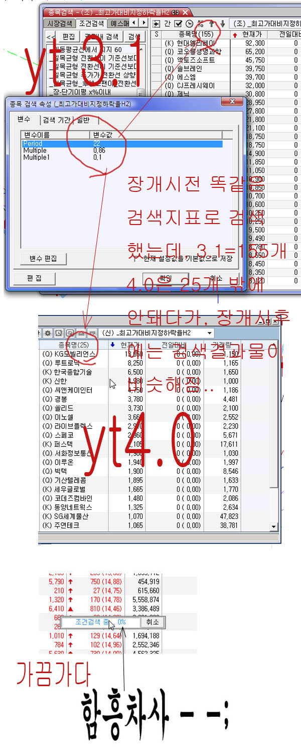 안녕하세요? 예스스탁입니다. 불편을 드려 죄송합니다. 내용 확인하도록 하겠습니다. 그리고 검색이 제대로 안되고 멈추어 있는 이유는 현재 3.1과 4.0을 같은 종목검색서버에서 나누어서 사용하기 때문에 발생하는 현상입니다. 병행가동 기간에는 해당 현상이 발생될 수 있으므로 양해를 부탁드리겠습니다. 감사합니다. > 마린 님이 쓴 글입니다. > 제목 : yt3.1 yt4.0 검색결과물이틀려요.. > 그림첨부..