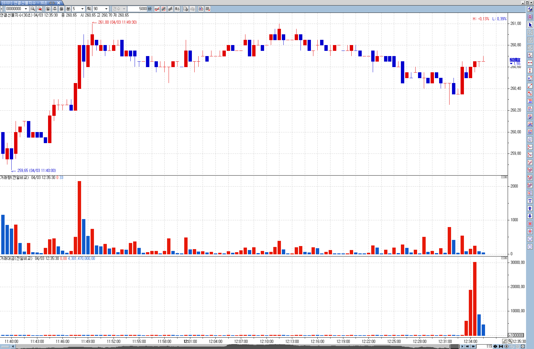 > 틱봉이나 분봉 차트에서는 거래대금(전일비교) 지표가 제대로 표시가 되는데