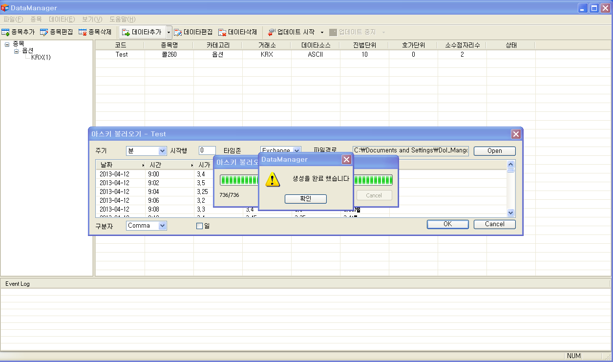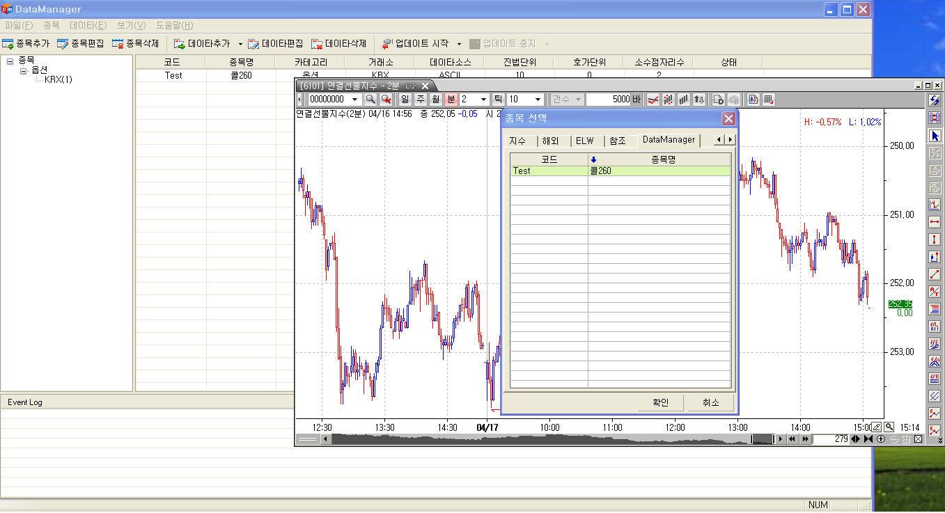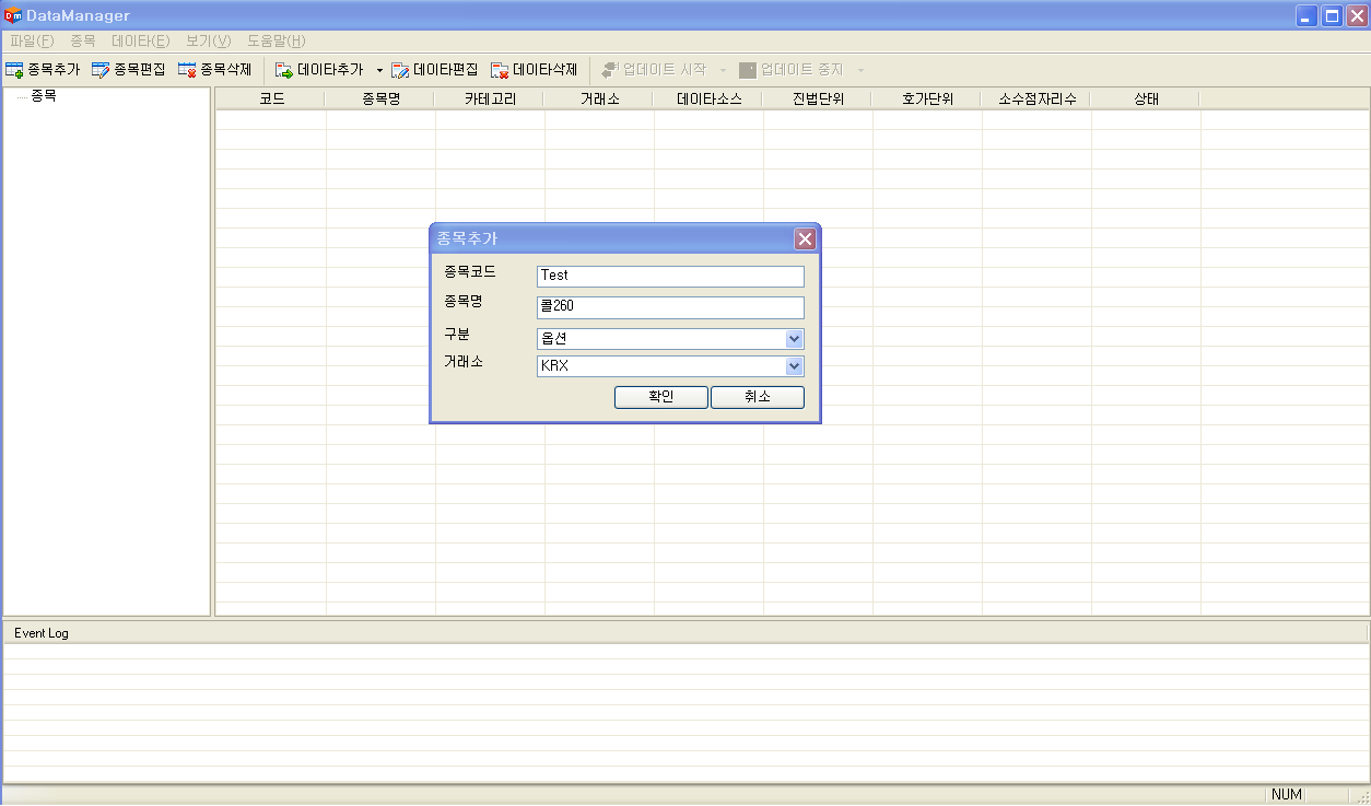 데이터매니저를 띄워 종목추가하고 데이터추가까지 잘 됩니다만