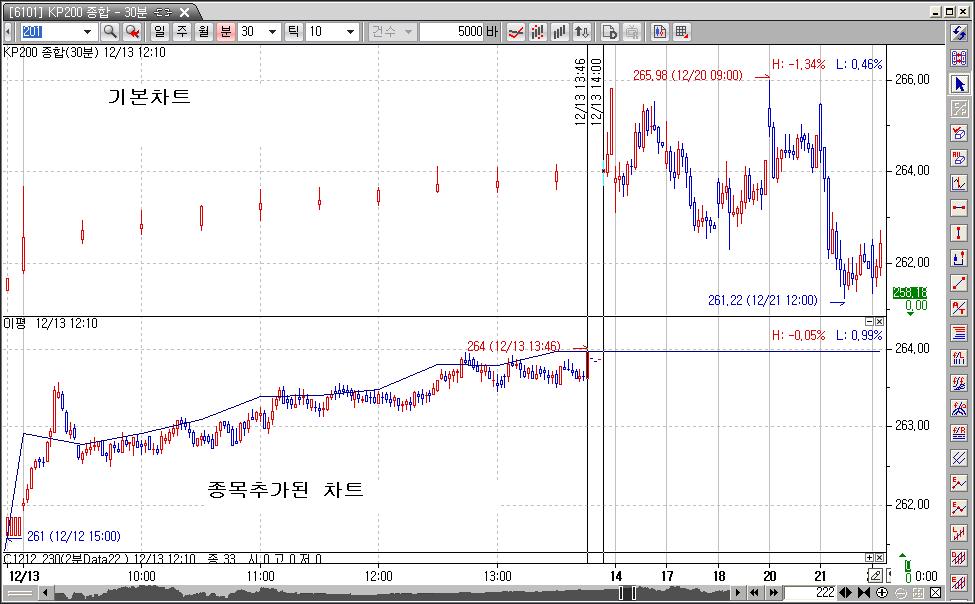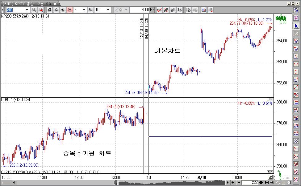 따라서 기본차트 2분봉으로 설정후 종목추가하여 2012년 12월 차트도 불러오게되면