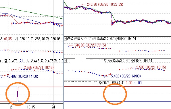 그러나 주차트를 틱차트로 바꾸면 첨부의 오른쪽그림과 같이 포지션 변화가 없습니다.