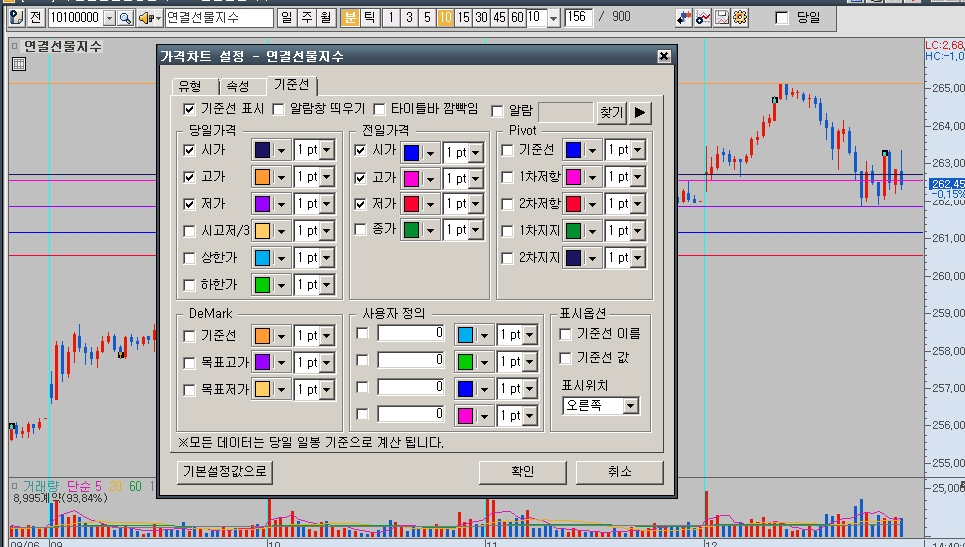 이왕 글을 쓰는김에 다른 HTS에는 보통 바로 마우스 몇번 클릭해서 쓸수있는 기준선을