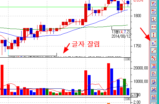 그림1은 봉개수 세기 툴팁 뒤쪽의 글자가 잘려나가 안보이고, 그림2는 글자 하단이 잘려나가고 상단만 살짝 보임.