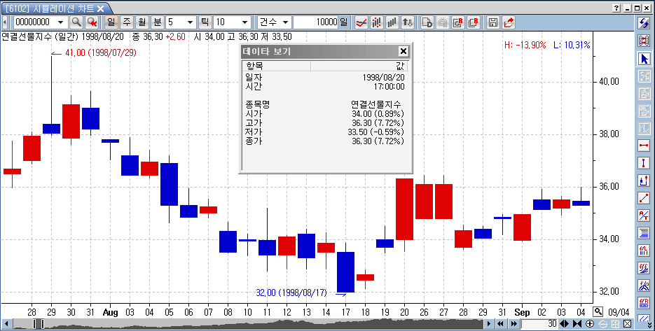 > 제목 : 일봉 연결선물지수 시뮬레이션차트에서 19980821~19980825 일봉이 온데간데없네요