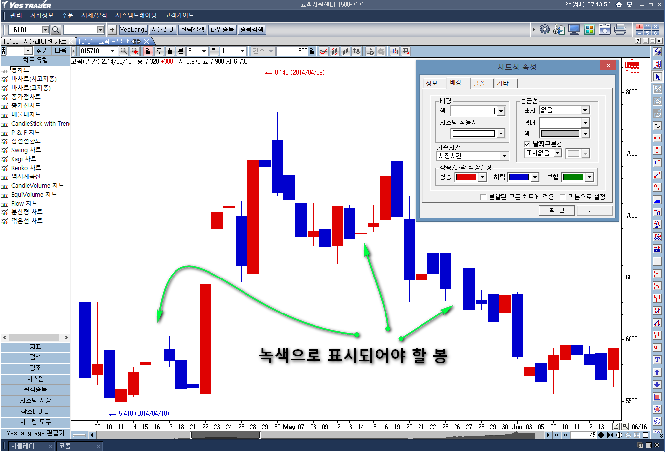 YT에서도 보합은 녹색으로 표시할 수 있도록 차트창 속성에는 표시가 되어 있는데 실제 차트에서는 표시가 되지 않고 있는 것 같습니다. 방법이 있을 것 같은데,,,,