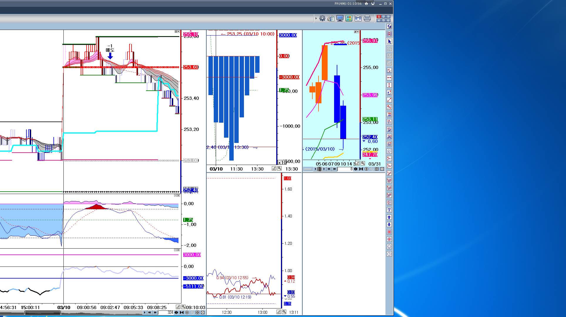 첨부화면 왼쪽 하단 보조지표중에 음영표시가 된 것이 30틱챠트의 Price Volume Trend인데요,