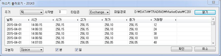 예상해 볼때 txt파일의 데이타 윗부분이나 아래 부분에 형식에 맞지 않는 어떤 값이 들어가 있는 것이 아닌가 생각됩니다. txt파일의 필드별로 첨부된 내용처럼 내용이 들어가 있는지 확인해 보시고, 이상이 없는데 동일현상이 나타난다면 chartist@yesstock.com으로 txt파일을 보내주시면 확인해 드리도록 하겠습니다.