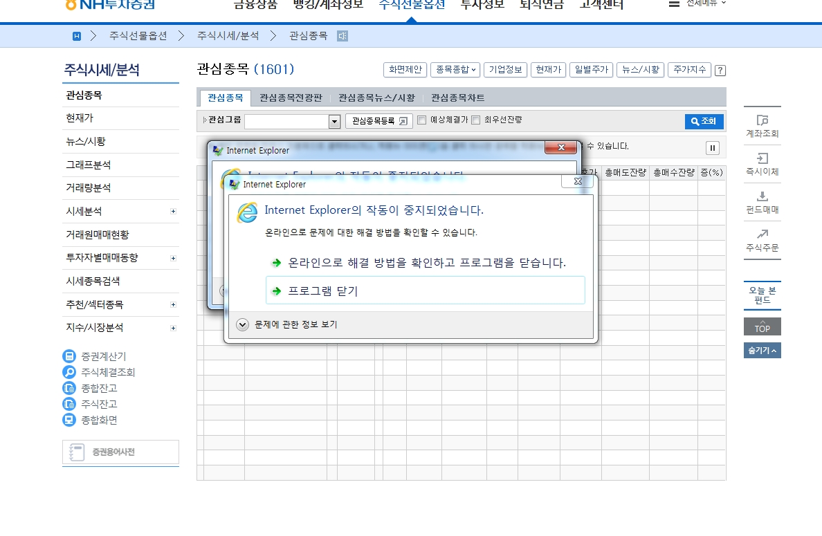 로그인해서 관심종목이나 시세같은 주식페이지 들어가면 이렇게 들어가면서 계속 꺼져버리네요 ㅜㅜ