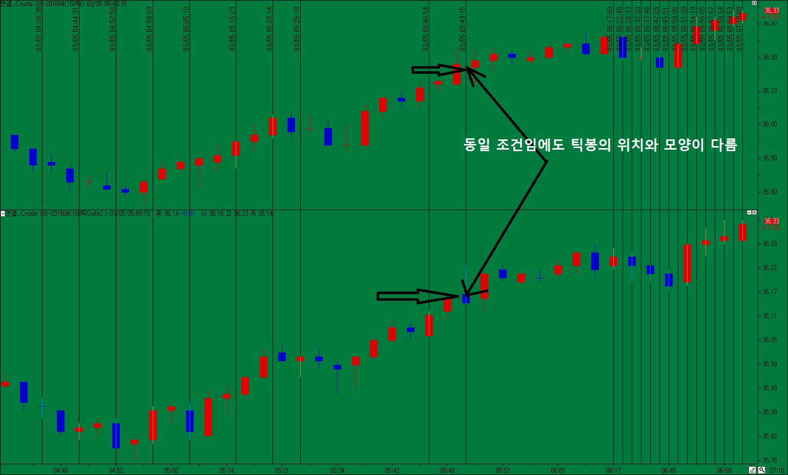 그림과 같이 동일조건(종목,틱수,건수 동일)임에도 틱봉의 모양과 위치가 다릅니다.