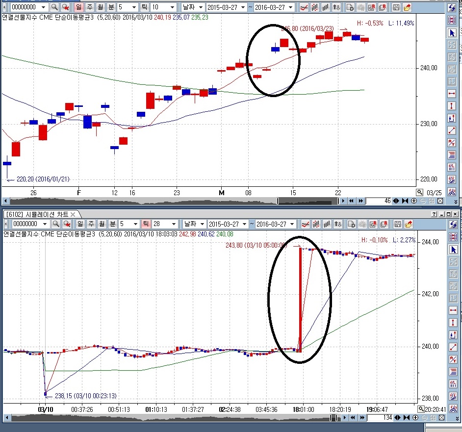 > 1. CME 틱차트에서 종가봉 표시가 이상합니다. 일봉차트에서는 정상인듯 한데...