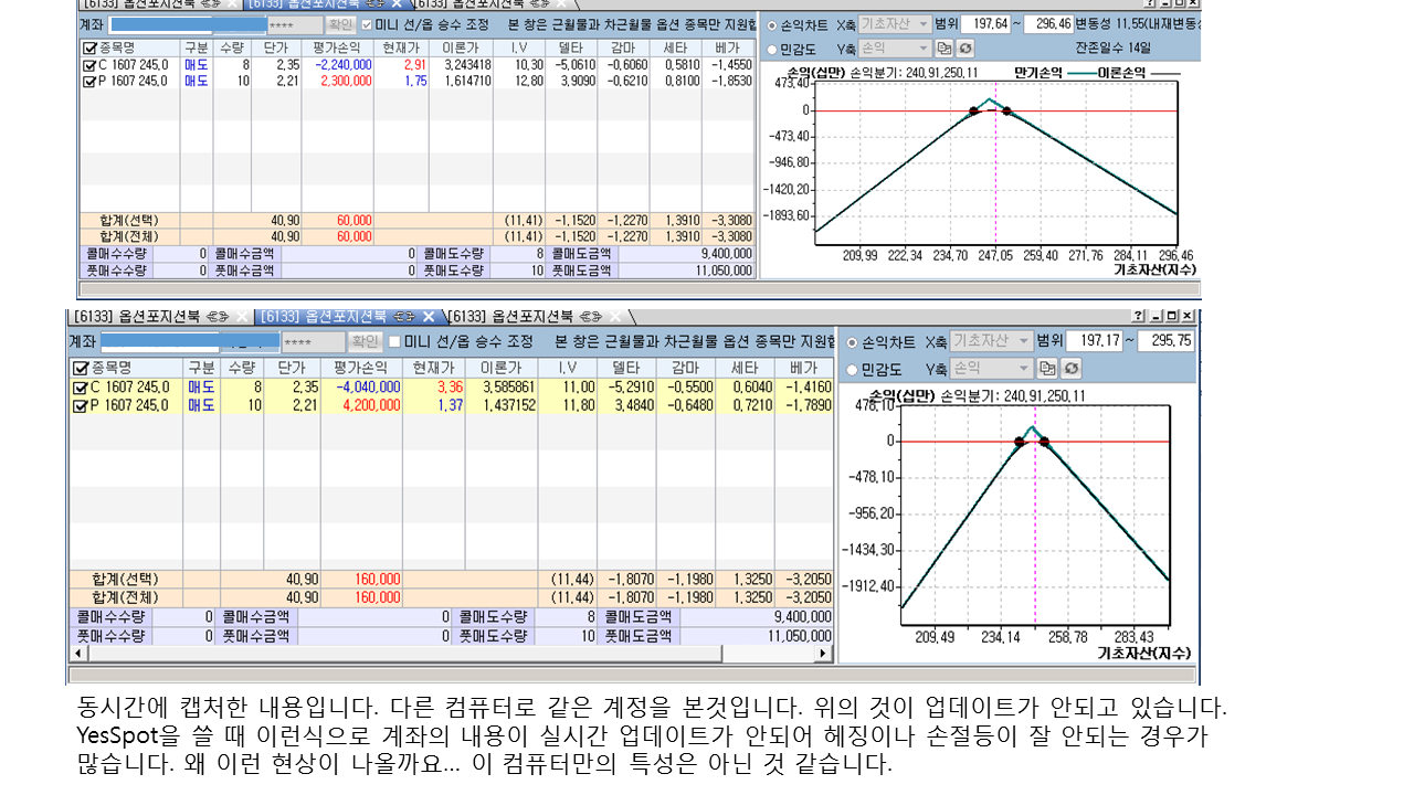YesSpot을 쓸 때 이런식으로 계좌의 내용이 실시간 업데이트가 안되어 헤징이나 손절등이 잘 안되는 경우가