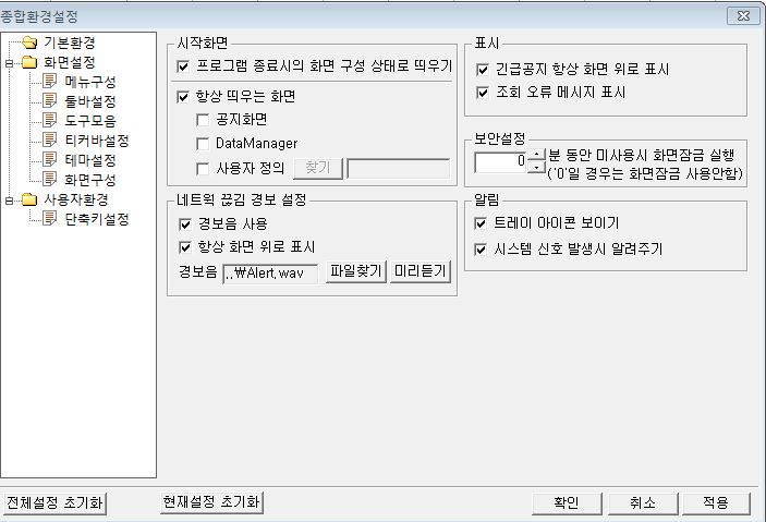 관리 – 종합환경설정 – 화면설정의 [시작화면] – 프로그램 종료시의 화면 구성 상태로 띄우기는 체크해두었는데도 마찬가지여서