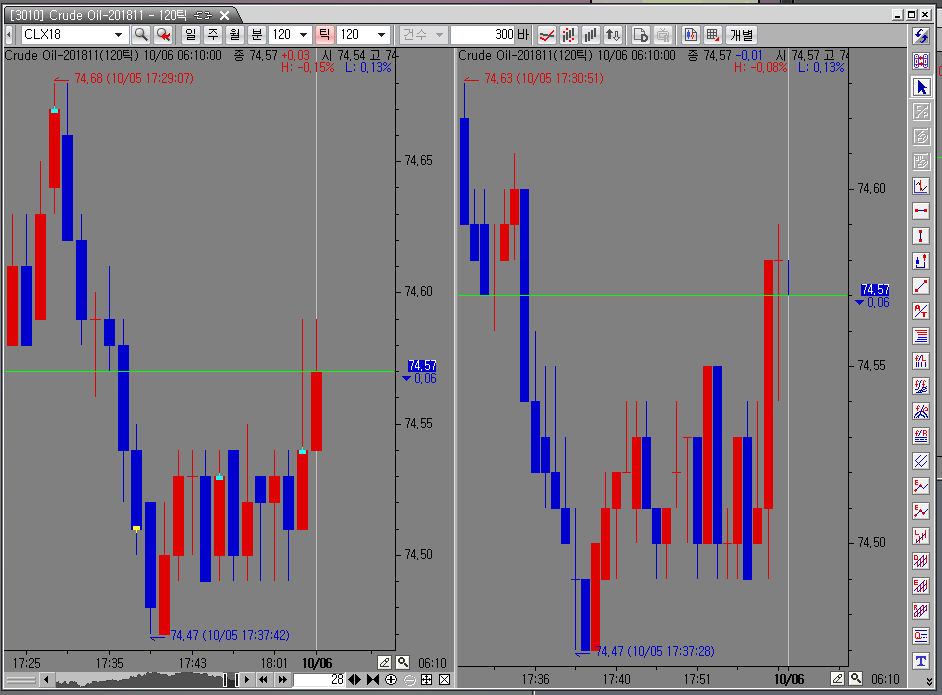 모든조건을 동일하게 했는데 표현되는 봉의 모양이 왼쪽과 오른쪽이 다릅니다