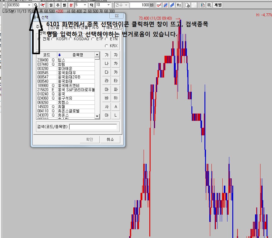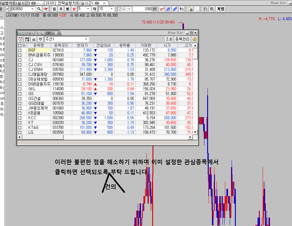 화면이 연동되어 있으면 관심종목 화면에서 종목 클릭시 연동된 화면의 종목이 클릭한 종목으로 변경됩니다.