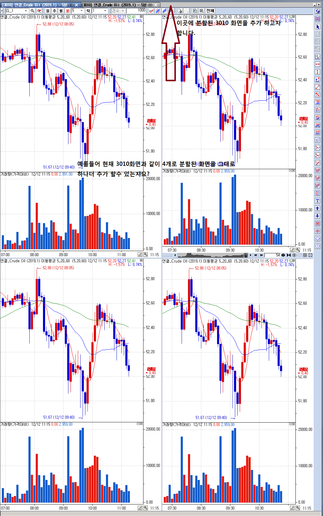 차트를 띄우고 다시 '차트분할선택' 아이콘을 클릭하여 저장해 놓은 화면틀을 열고