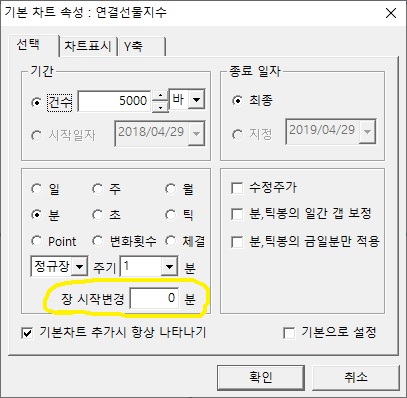 "기본 차트 속성 -> 선택" 메뉴에서 "장 시작변경" 은 무슨 기능인가요?