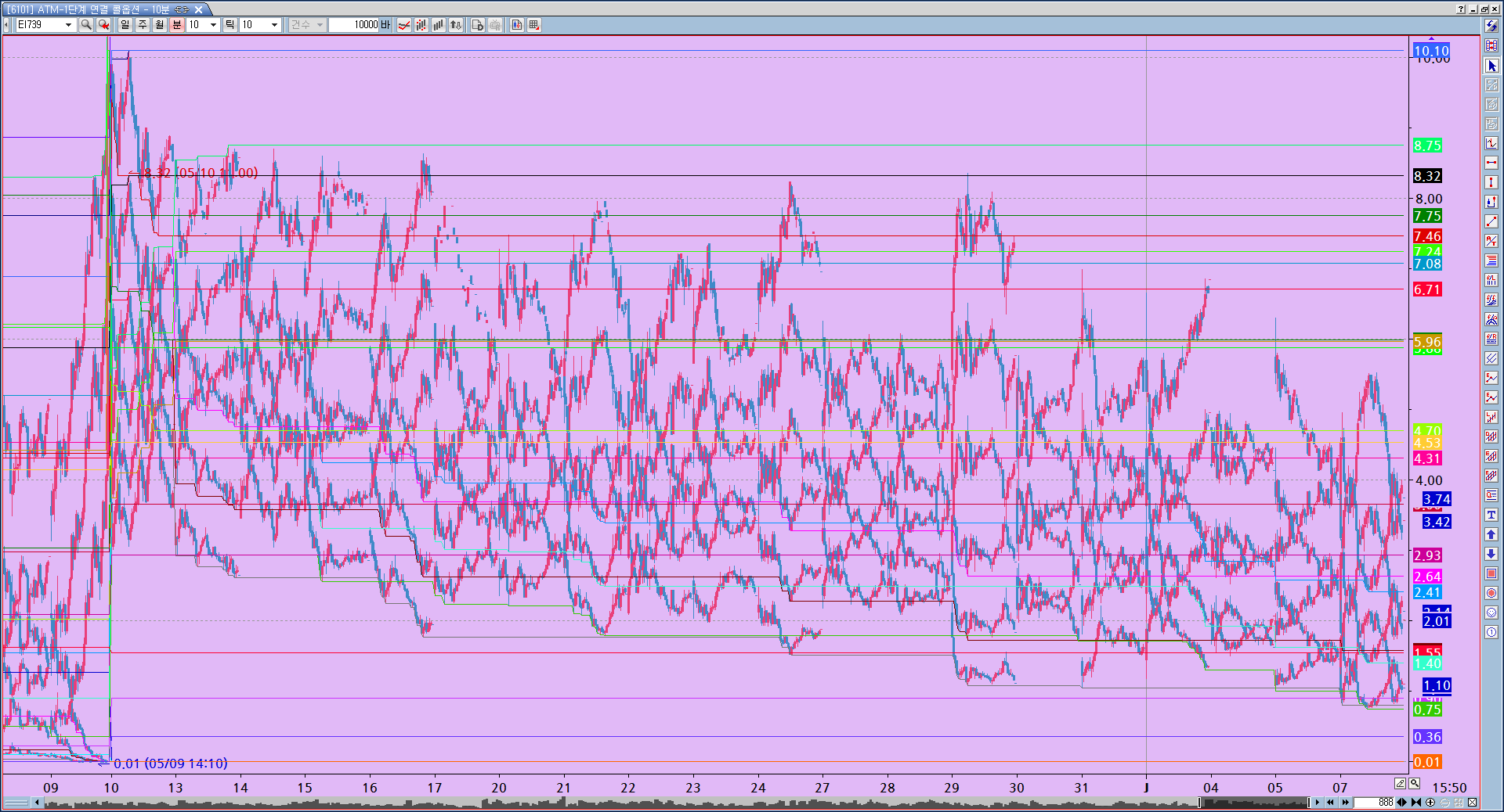 > 교차차트로 6개정도 콜/풋 행사가를 겹쳐보았는데