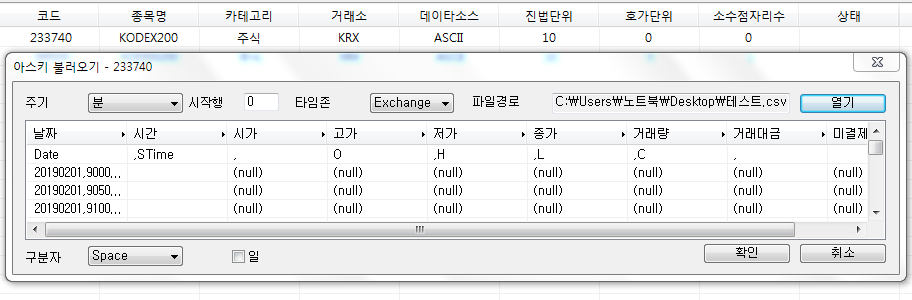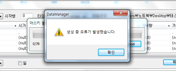 > csv파일을 아스키불러오기해서 차트에 띄워보려는데 데이터 추가 과정부터 되지가 않네요,,,위의 그림과 같은 오류상황입니다.