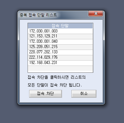 접속하실 때 중복접속단말리스트화면에서 접속차단을 클릭하게 되면