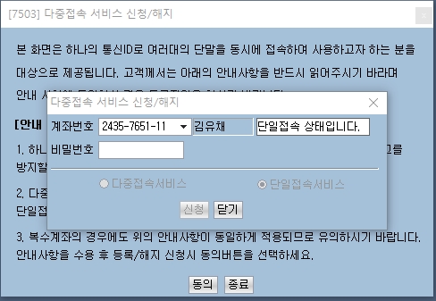비밀번호는 계좌비밀번호를 넣으시고 'enter 키를 누르시면' 아래 선택 내용이 활성되어 선택할 수 있습니다.