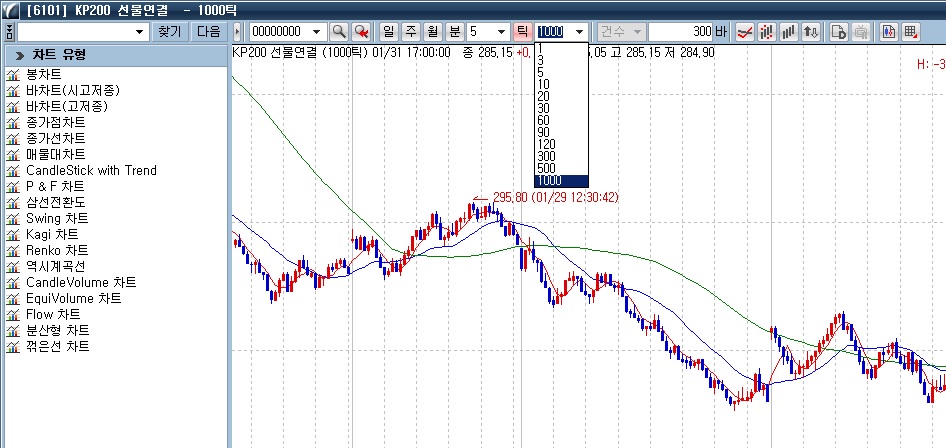 차트 틱으로 볼때 250틱으로 보고 싶습니다. 1000,500,300 이런 단위를