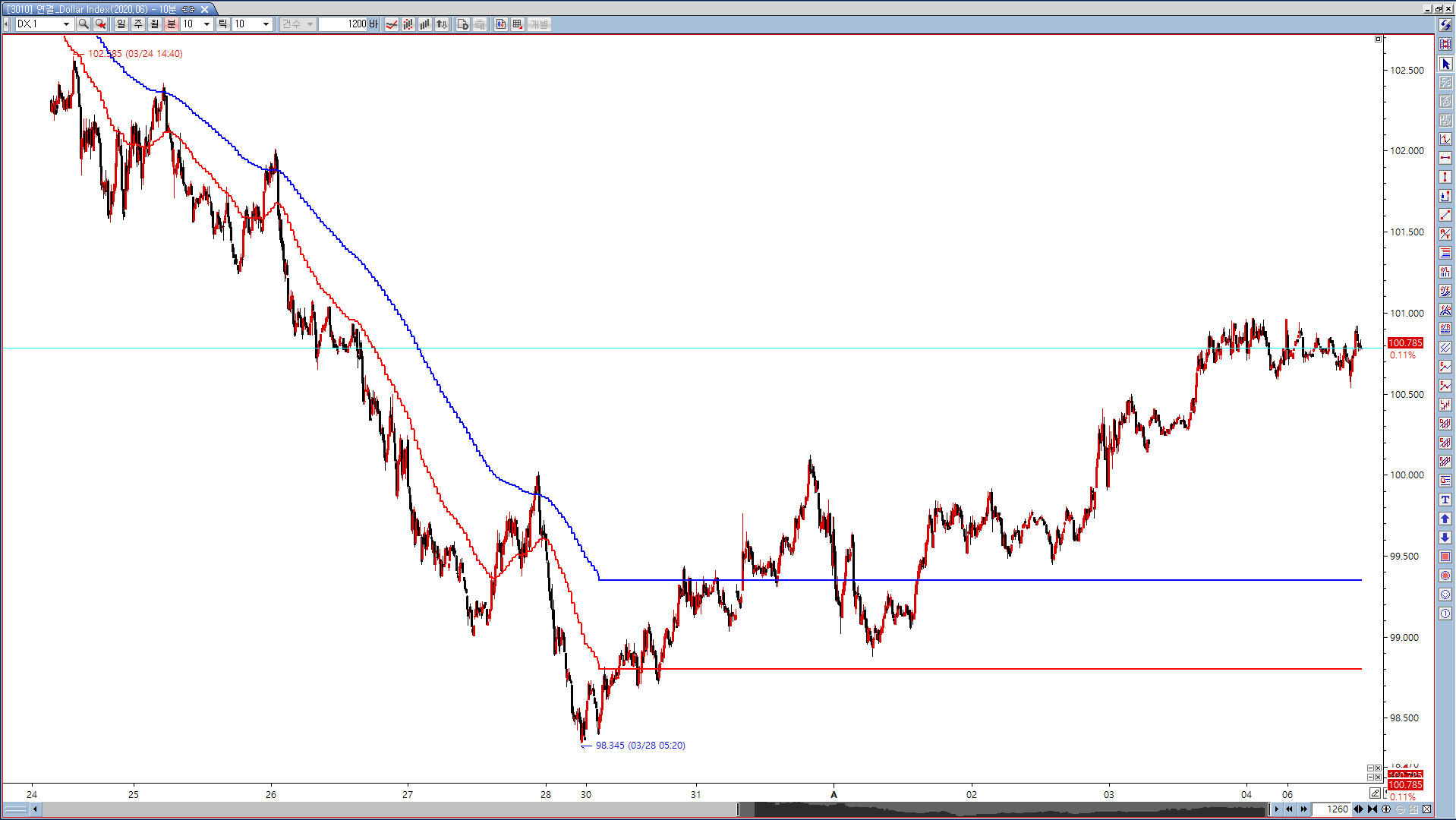 첨부한 이미지와 같이 data2와 data3를 사용할 경우 특정시점부터 수평선으로 그어지는 현상입니다. 다른 종목에는 이상이 없는데 달러인덱스에만 나타나는 현상입니다.