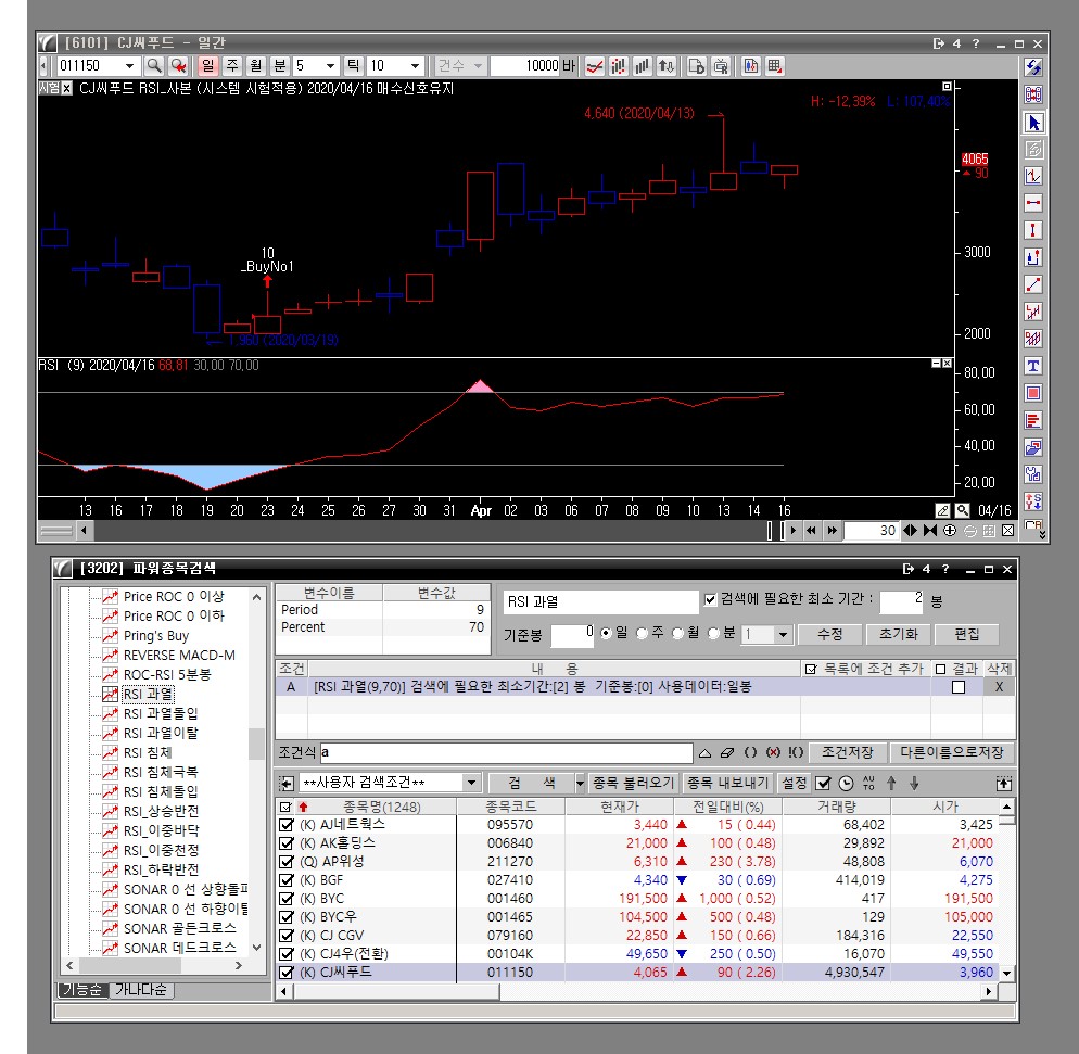 ex) RSI9,70 과열 검색, 했는데, 금일(2020-04-16)에 CJ씨푸드는 차트보면 알겠지만, 해당사항이