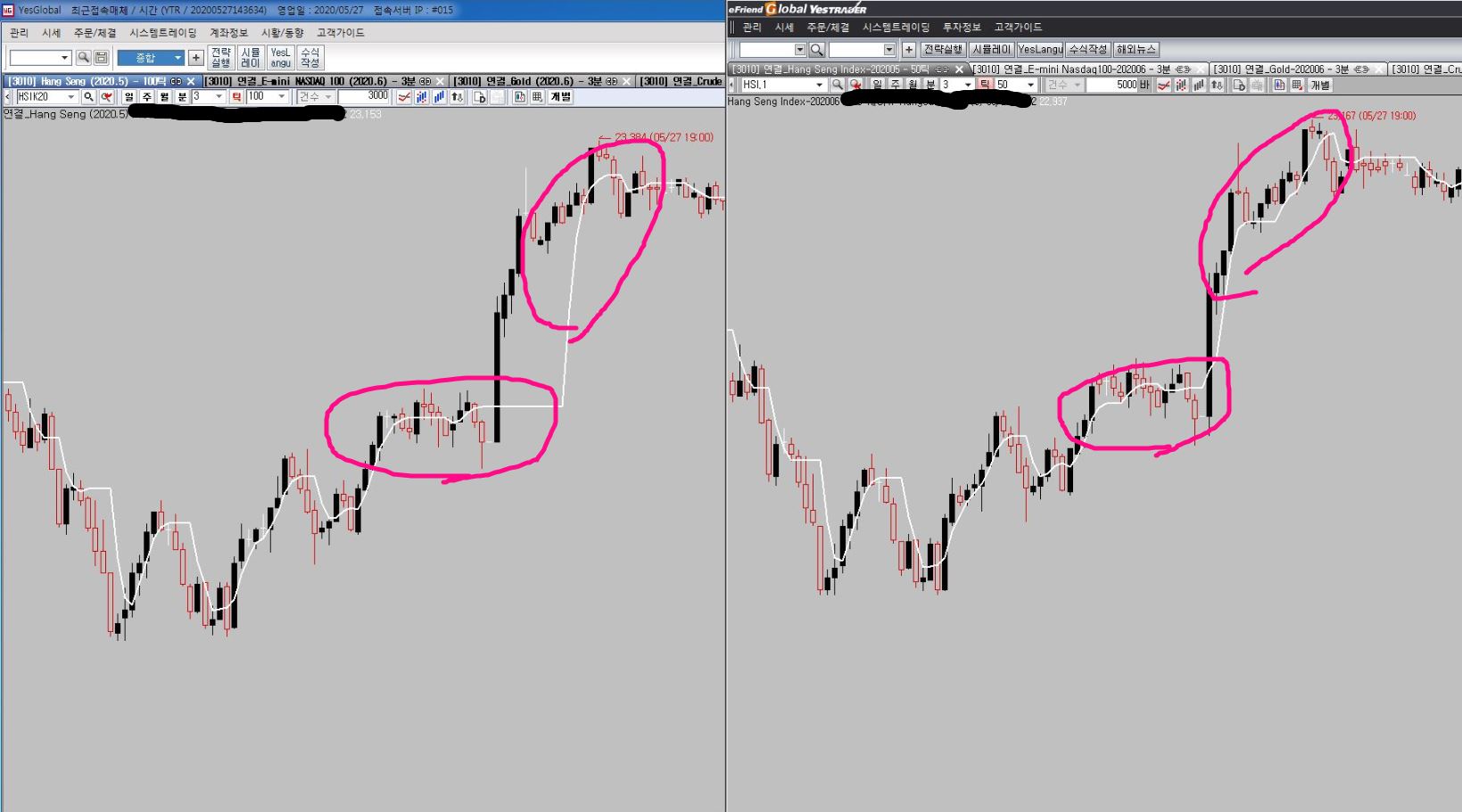 캡처 안 된 분할 된 우측 차트가 각기 100틱과 50틱 차트였고요..