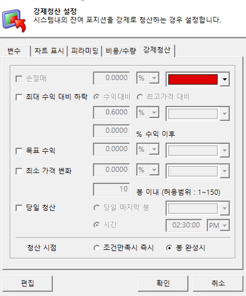 시스템식 내에서 강제청산(손절매:setstoploss) 함수가 사용된 경우 시스템트레이딩 설정창의 강제청산 탭에서는 체크를 할 수 없습니다.