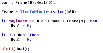 배열에서 array 선언 부분에 붙임과 같은 지표식 예시가 있습니다. 지표식 하단에 있는 'timetominutes(stime)%분단위' 해설을 통해 대부분은 이해가 되었으나, 'dayindex == 0'이 필요한 이유를 이해하지 못하였습니다. 실제로 이 부분을 삭제하고 실행하니 00:00분에 고가가 변경이 되는게 아니라 00:01분에 변경이 되는 것을 확인하였습니다. 아마 그 때문에 'dayindex == 0'이 사용되는 것으로 보이는데, timetominutes(stime)%분단위 함수가 왜 00:00에만 적용되지 않는 메커니즘을 알고 싶습니다.