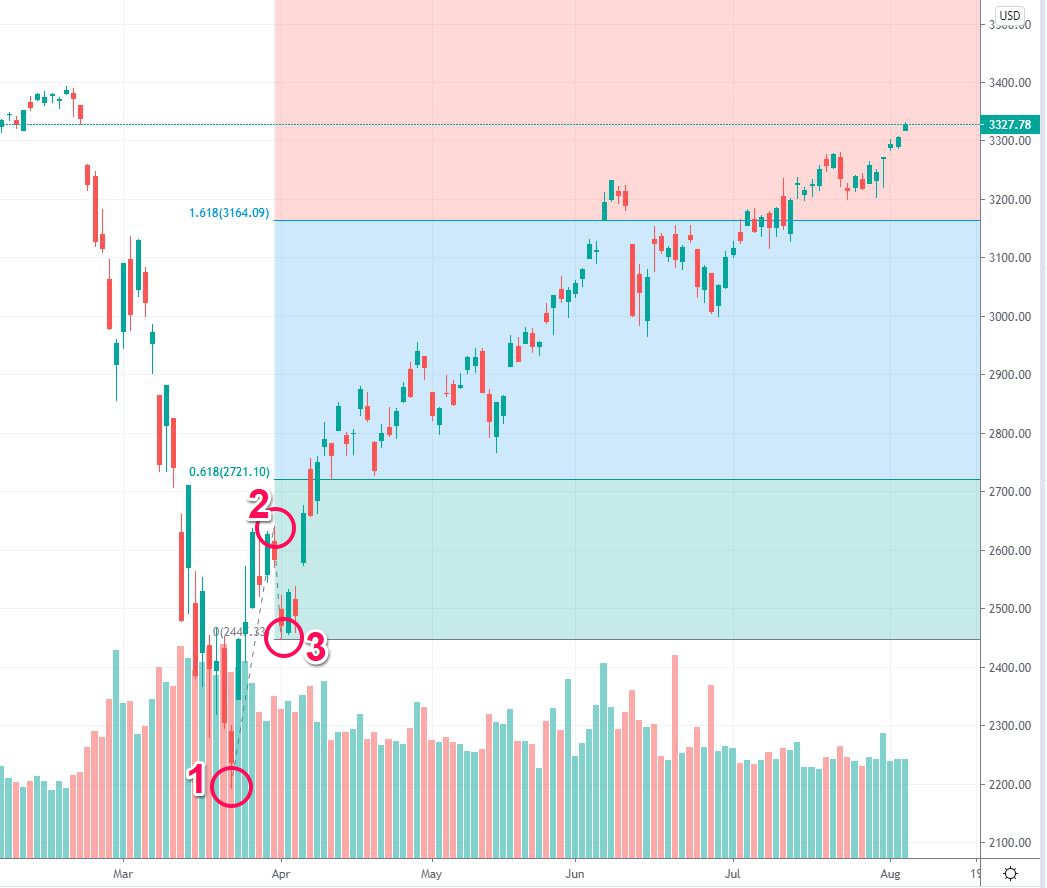Trend-based Fibonacci Extension 기능으로 그림과 같이 3개의 점을 찍어 3번으로부터 피보나치 비율만큼 상승하는 지점을 선으로 표현하는 기능입니다.(Q&A에 검색한 결과 2018년에도 다른분께서 반영을 요청하여 검토한다는 답변도 확인하였습니다.)