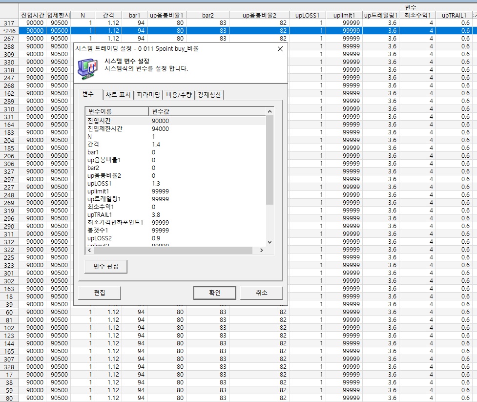 별첨파일은 090000 090500로 놓고 변수들을 최적화 해가다가 두번째 셀을 클릭하는 순간