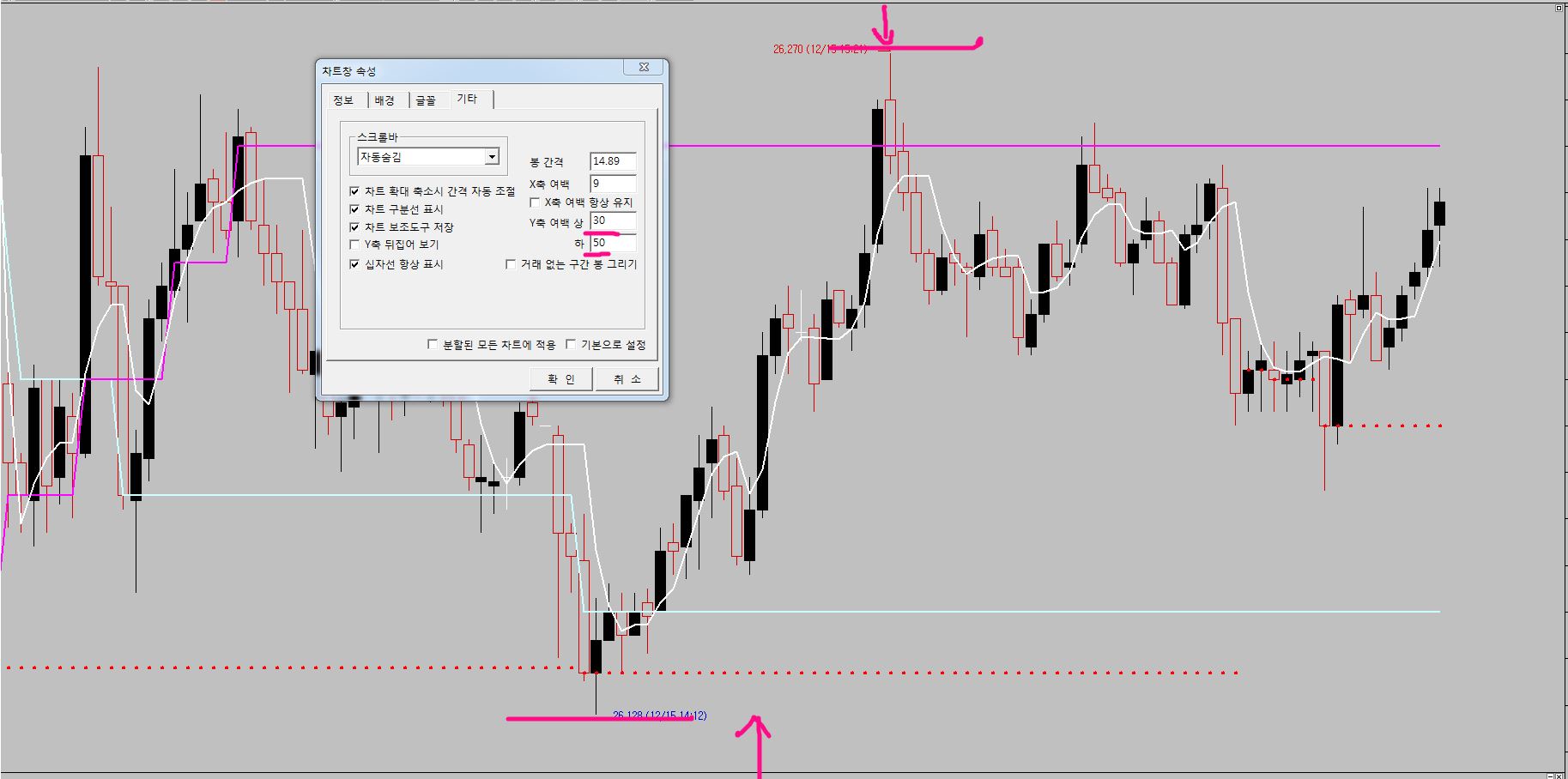 차트에서 캔들 수를 줄여 확대해도 상하 여백 넓이가 좁혀지지 않습니다.