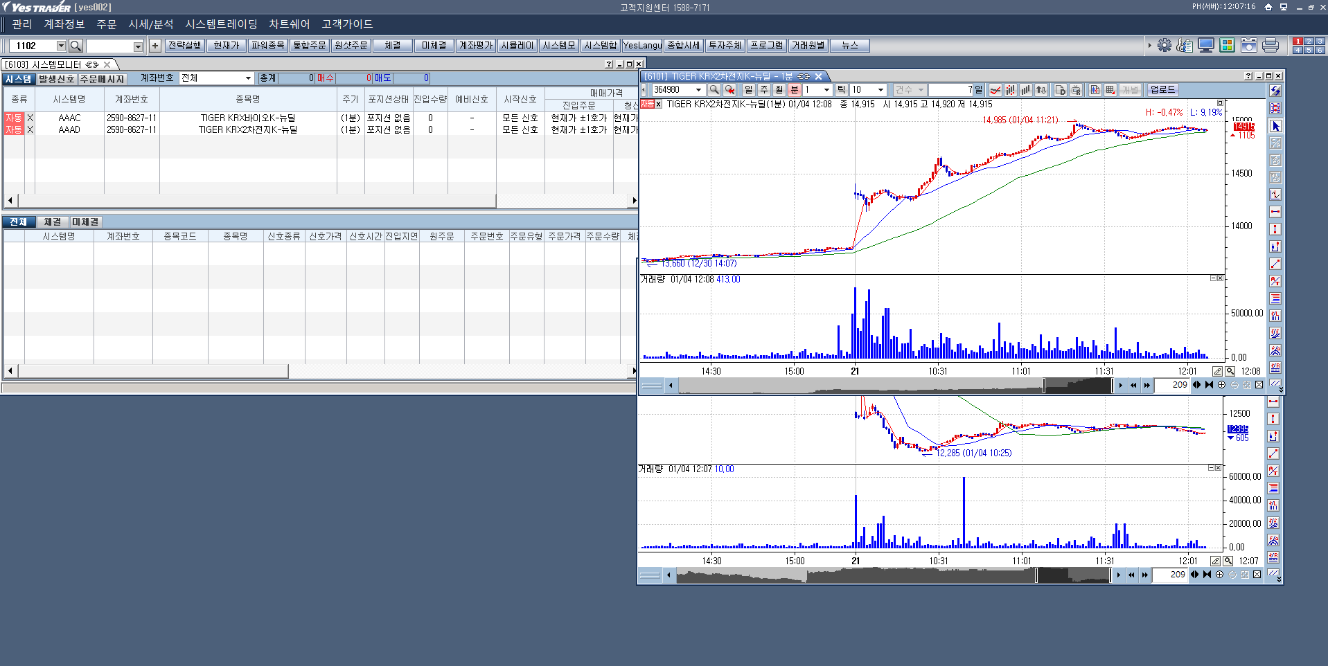 예스트레이더를 계속 실행시켜 주어야 자동매매가 실행됩니다. 예스트레이더 프로그램을 종료하시면 자동주문도 종료됩니다.