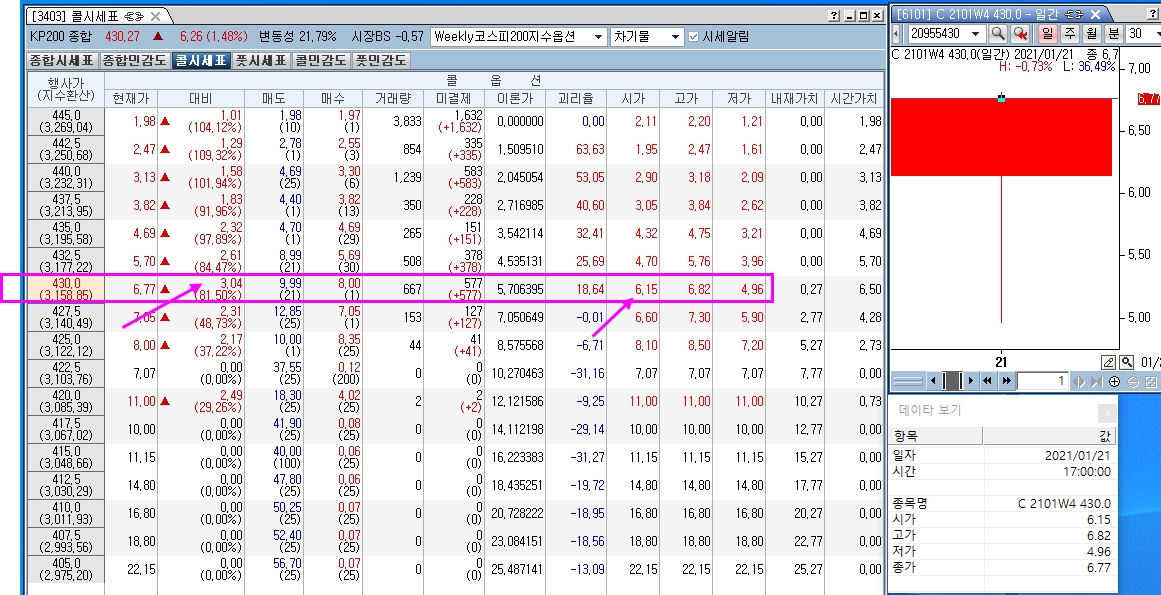 전 행사가가 동일하므로 콜430만을 가지고 보면