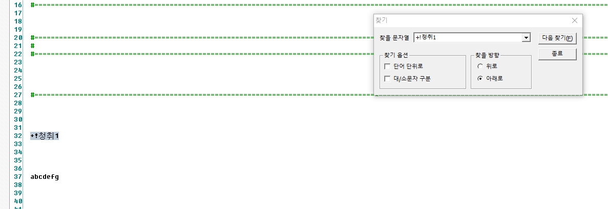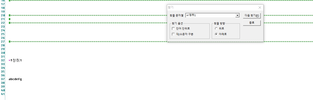 찾기 기능이 위에서 아래로 할 때는 정상작동하고 아래에서 위로 찾을 때는 찾지를 못합니다. 첨부사진에 커서가 나오지 않는데 첫번째는 위쪽에 위치시켰고 두번째는 마지막라인에 위치시켜 찾기를 한 결과입니다.