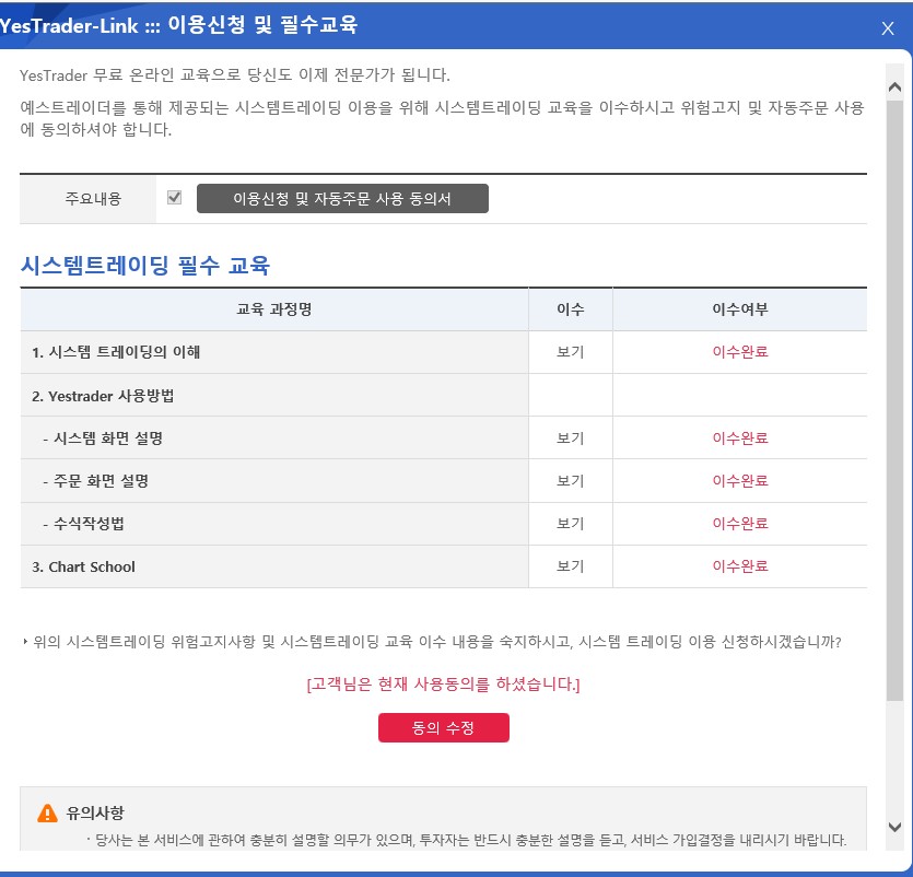 모두 이수완료에 이용신청 및 자동주문 동의까지 완료하였는데