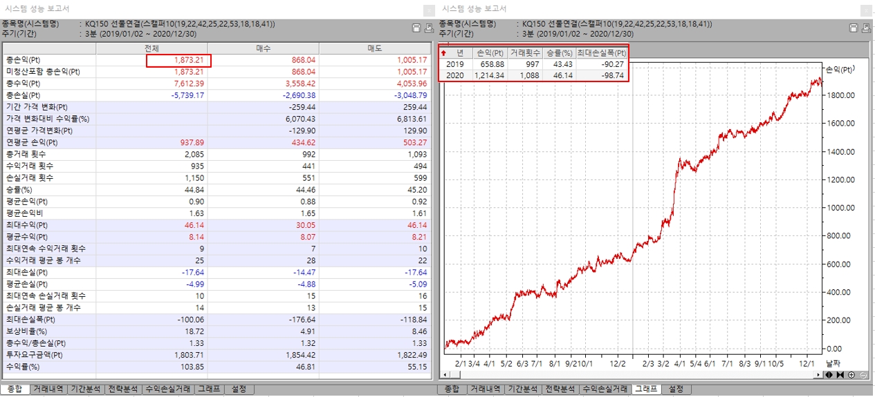 동일한 시스템의 동일한 변수로 적용했을때 기간을 늘렸다고 해서 년도별로 손익이 달라지지는 않습니다. '수정주가'에 체크해 놓을 경우 월물변경시마다 과거 데이터가 소급되어 변경되기 때문에 기간을 늘리면 과거 데이터가 달라져서 성과가 다르게 나오는 것 아닌가 생각됩니다. '수정주가' 체크를 해제하고 테스트를 하셔야 과거의 고정된 데이터로 테스트가 가능하십니다.