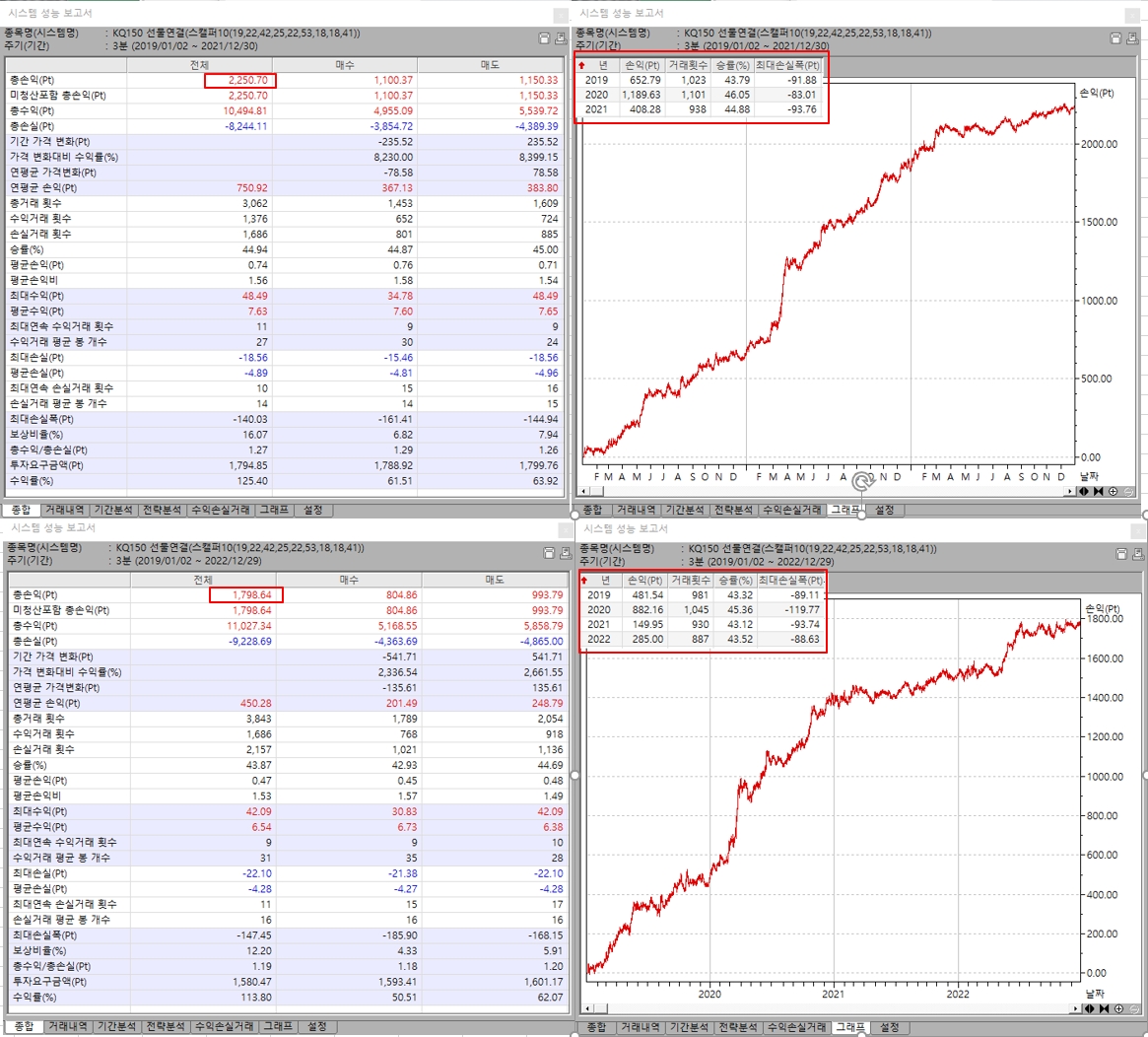 먼저 2018-01-01 ~ 2020-12-31 로 기간을 지정하여 성과보고서로 년도별 손익을 확인한 이후에, 동일한 차트에서 끝기간을 1년씩 늘리면서 년도별 손익이 변하는지 확인해 보셔야 할것 같습니다. 즉, 2번째는 성과보고서를 띄워 놓은 상태에서 2018-01-01 ~ 2021-12-31 로 끝기간만 변경 시켰을때 년도별 손익에서 2018년과 2019년은 동일하게 나와야 하고 2020년은 다르게 나오는 것이 맞습니다. 3번째는 2018-01-01 ~ 2022-12-31 로 끝기간을 늘렸을때 2번째 테스트의 2021년은 다르지만 그 이전의 년도별 손익은 동일하게 나와야 합니다.