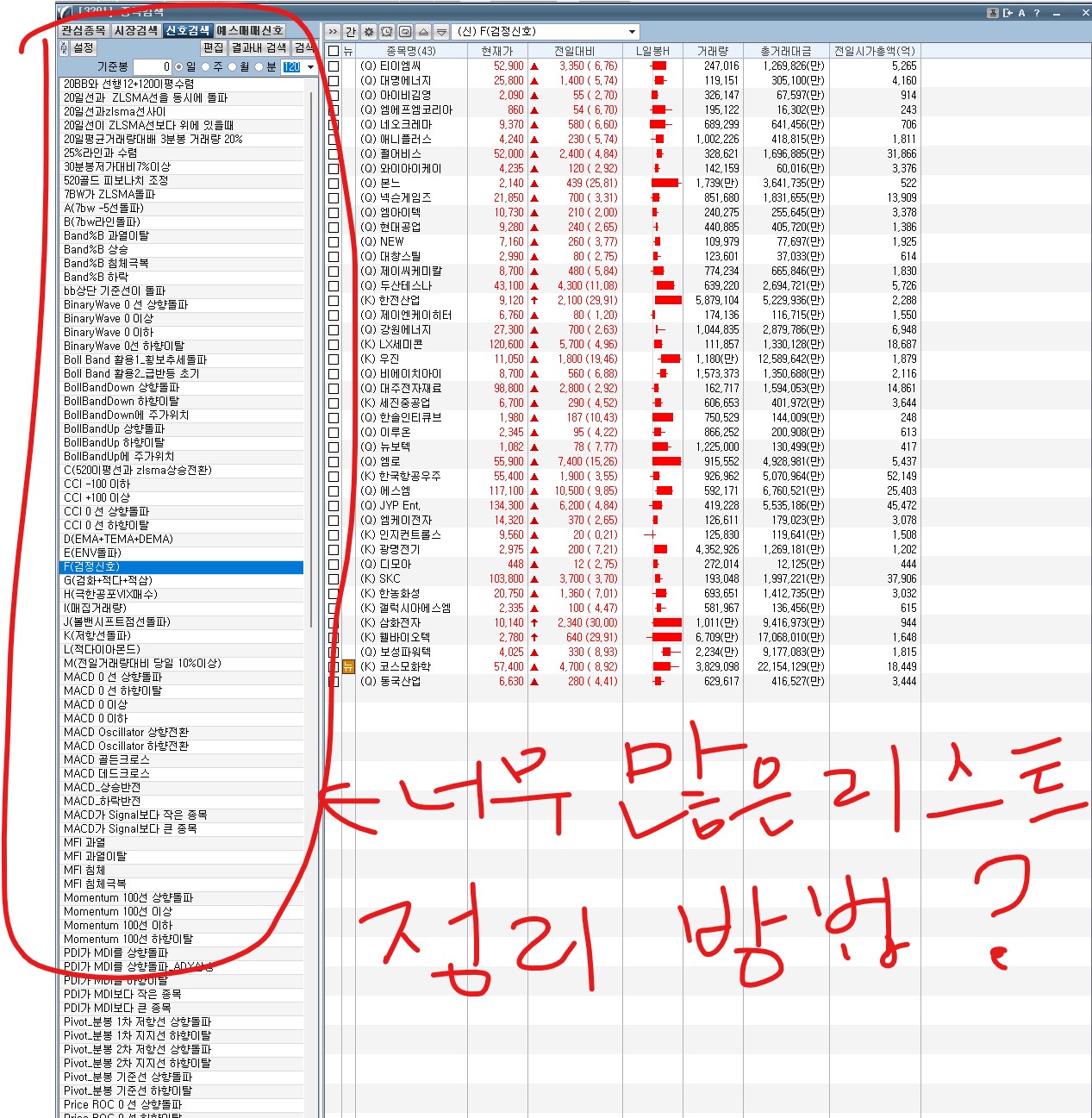 예스트레이더에서 규칙을 만들고 3201에서 신호검색을 보는데... 너무 많은 리스트로 인하여 좀 보기가 빨리 찾기가 어렵습니다. 이것을 쉽게 소트하는 방법은 없나요? 폴더를 만들어서 쉽게 볼수 없나요? 제가 만든 것만 보고 싶은데