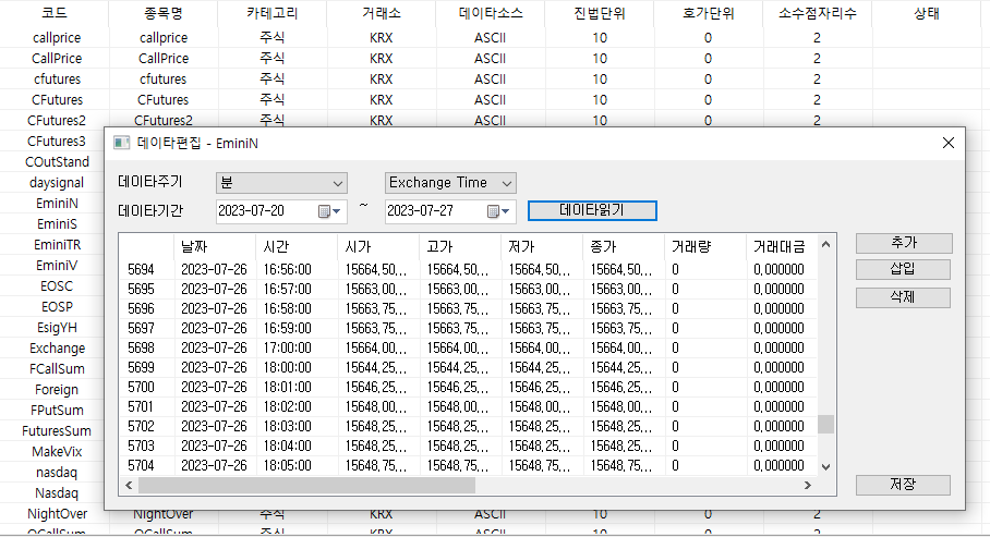 그런데 cme나스닥 데이터가 한국시간기준 17~18시에도 생성이 되어서(첨부파일1) 데이터매니져로 전송이 됐는데 데이터매니져 데이터편집에서는 데이터가 입력되지 않고있습니다(첨부파일2)