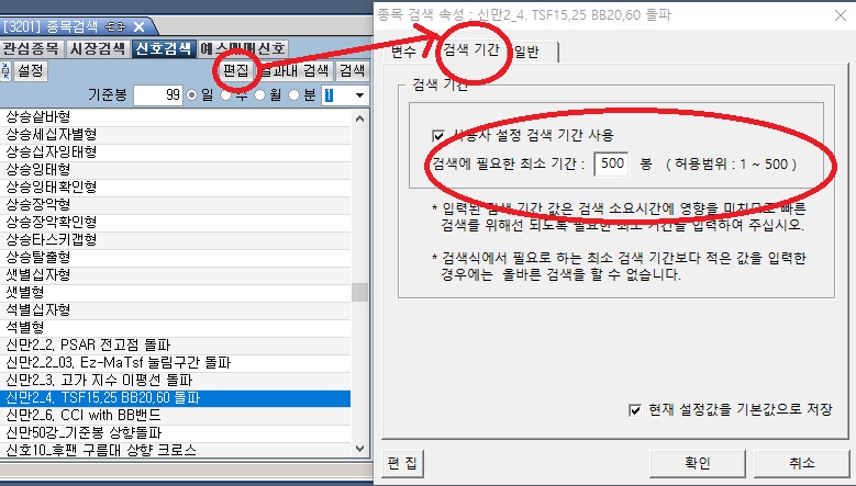 첨부파일2: 종목검색(3201)에서 편집을 누르면 종목검색 속성창이 뜨고 "검색기간"을 선택하면 1~500까지 입력할 수 있게 되어 있는데 기준봉 입력하는거와 무슨 차이가 있는건지요?