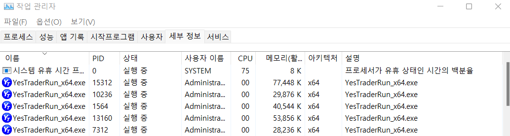 프로그램을 정상적으로 종료해도 YesTraderRun_x64.exe 프로세스가 종료되지 않고 계속 남아있습니다.