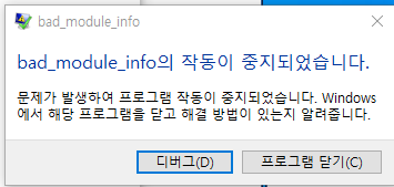 ps2 : 조금 전에 통화로 조치한 방법으로 finish 폴더 밑의 것을 지워서 정상 로그인이 되었는데, 다시 개발중이던 예스스크립트를 실행시키니 bad module info 에러 팝업이 뜨네요. 원인은 예스스크립트에서 일어난게 맞는 것 같습니다. 에러가 나지 않는 버전과 에러가 나는 버젼의 소스 코드가 모두 있어서 우선은 둘의 차이를 비교하면 어떤 것에 의해서 영향을 받은 건지는 찾을 수 있을 것 같습니다. 분석 후에 다시 추가 문의글 올리겠습니다.